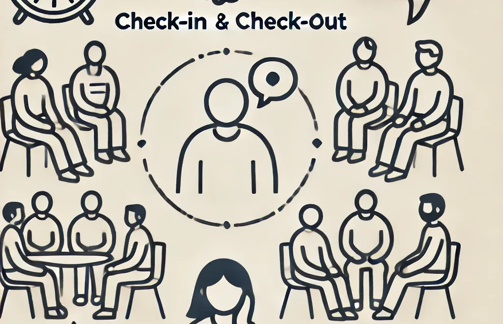 Check-in und Check-out sind Rituale in Meetings. Beim Check-in können alle Teilnehmerinnen ankommen und Kontext füreinander schaffen, indem sie mitteilen, wie sie gerade da sind. Typische Fragen, die jeder reihum beantworten kann, sind: „Wie bin ich heute hier?“ oder „Was hat meine Aufmerksamkeit?“