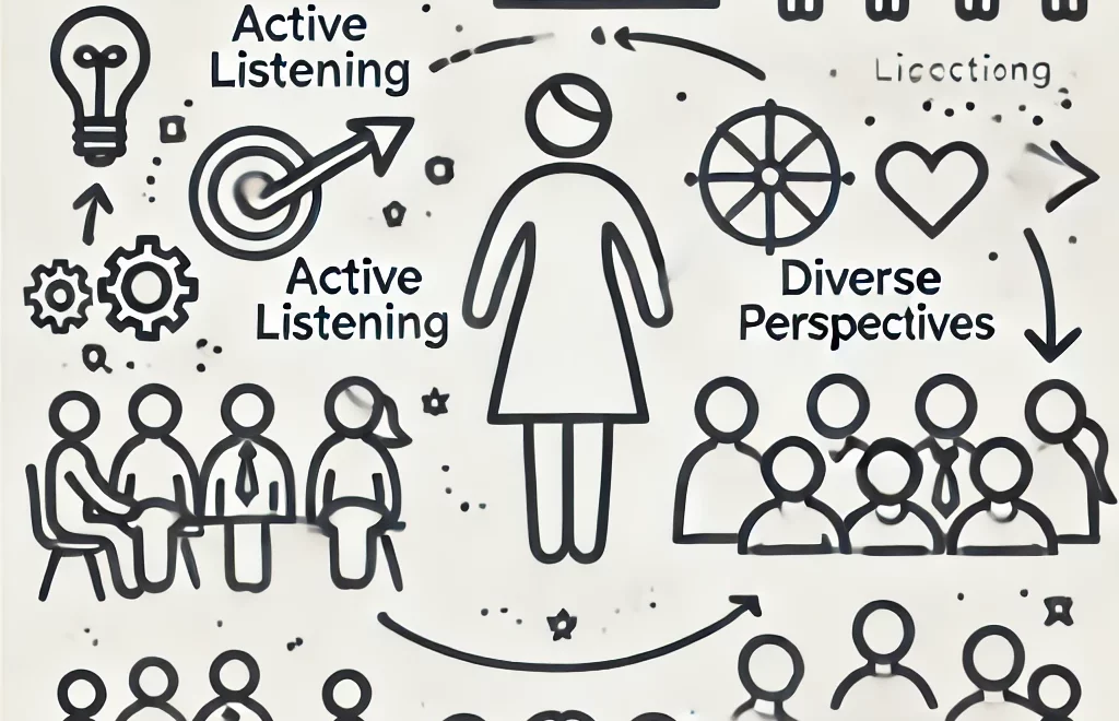 - Den Raum und die Menschen beobachten und aktiv zuhören.