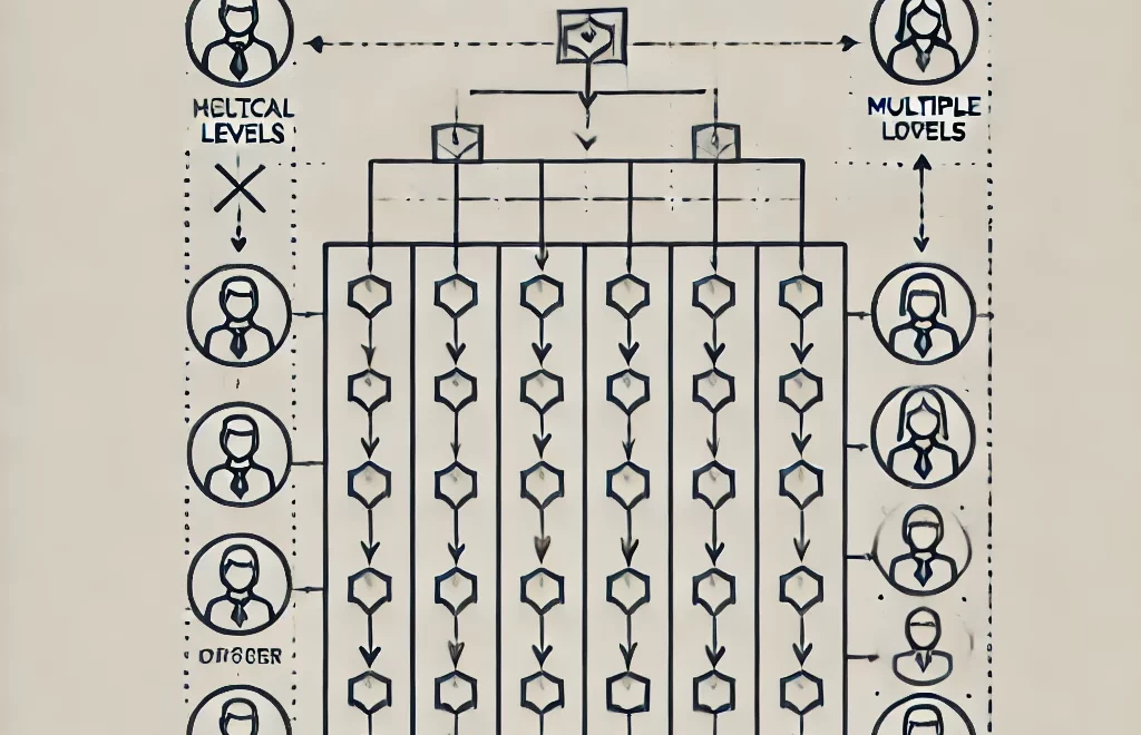 Anders als in der Pyramide gibt es nicht mehr nur eine Richtung: von oben nach unten. Stattdessen laufen in der Matrix-Organisation die Befehlsketten von oben nach unten, aber auch von links nach rechts oder andersrum.